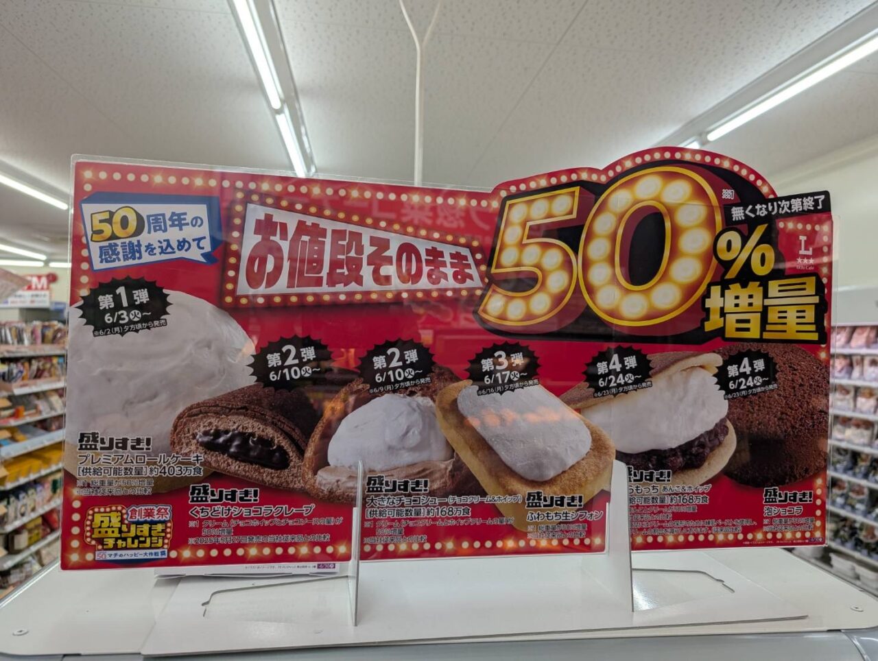 2025年6月3日から6月30日まで、全国のローソン店舗およびデリバリーで、「50周年の感謝を込めて、お値段そのまま!50%増量 盛りすぎチャレンジ」を実施中です!
