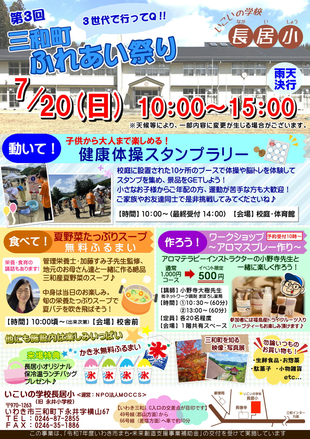 第3回三和町ふれあい祭りが、2025年7月20日に、いこいの学校長居小学校にて開催されます。