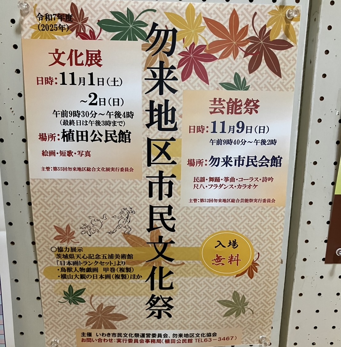 2025年11月1日・2日、 勿来地区市民文化祭の文化展が植田公民館にて開催されます。