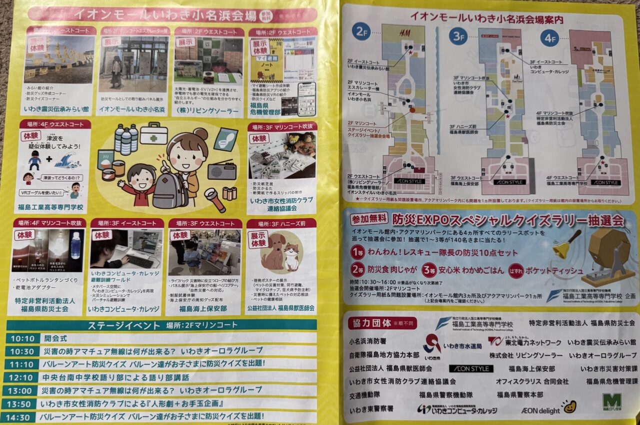 イオンモールいわき小名浜では、防災クイズや津波疑似体験、パネル展示や新聞紙で作るスリッパの作成など、災害が起きた時に役立ちそうな体験をすることができます。