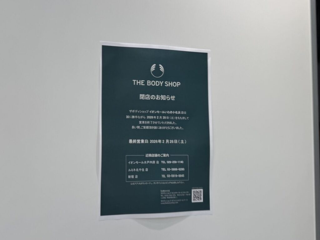 なんと、THE BODY SHOPイオンモールいわき小名浜店が、2026年2月28日をもって閉店してしまいました。