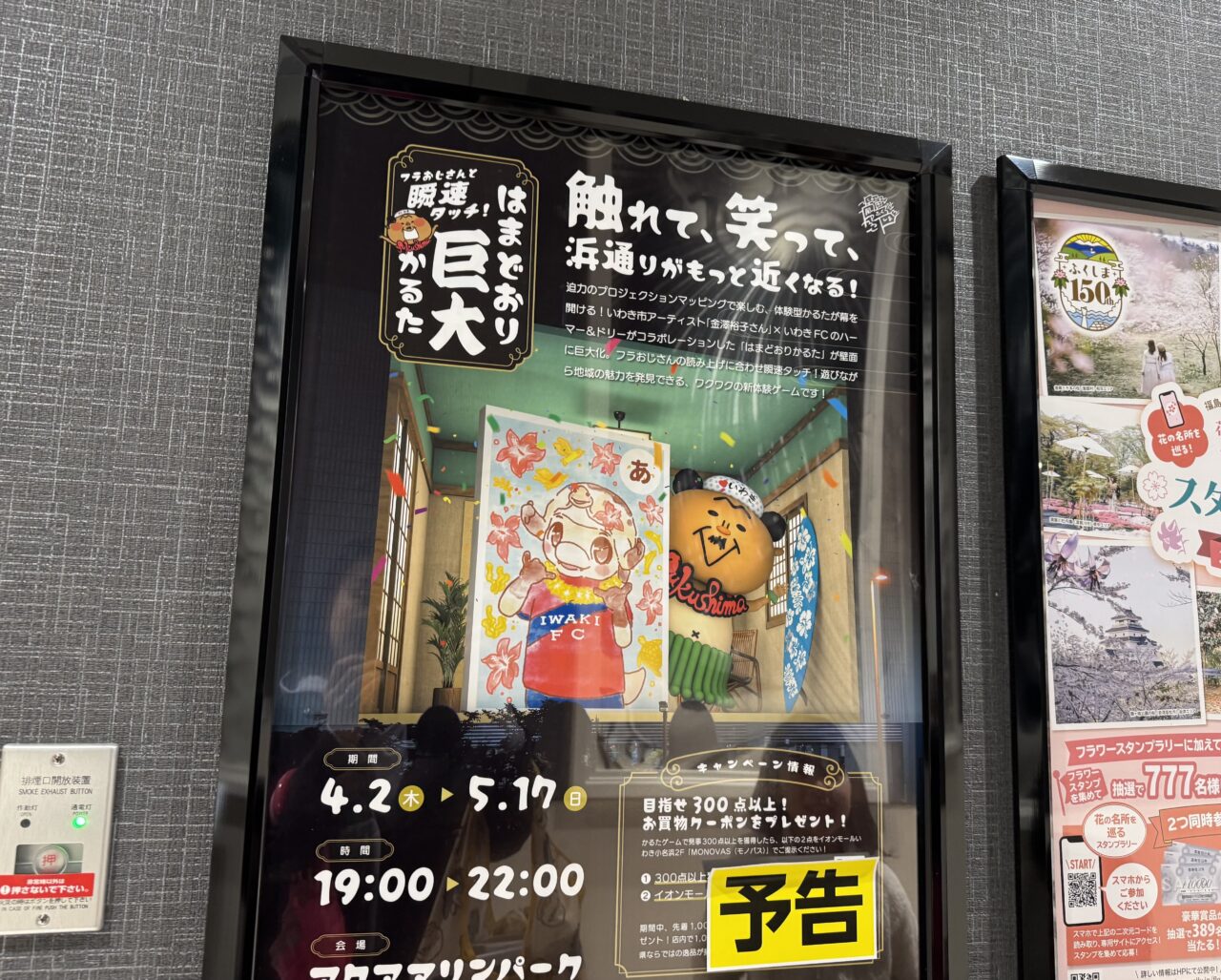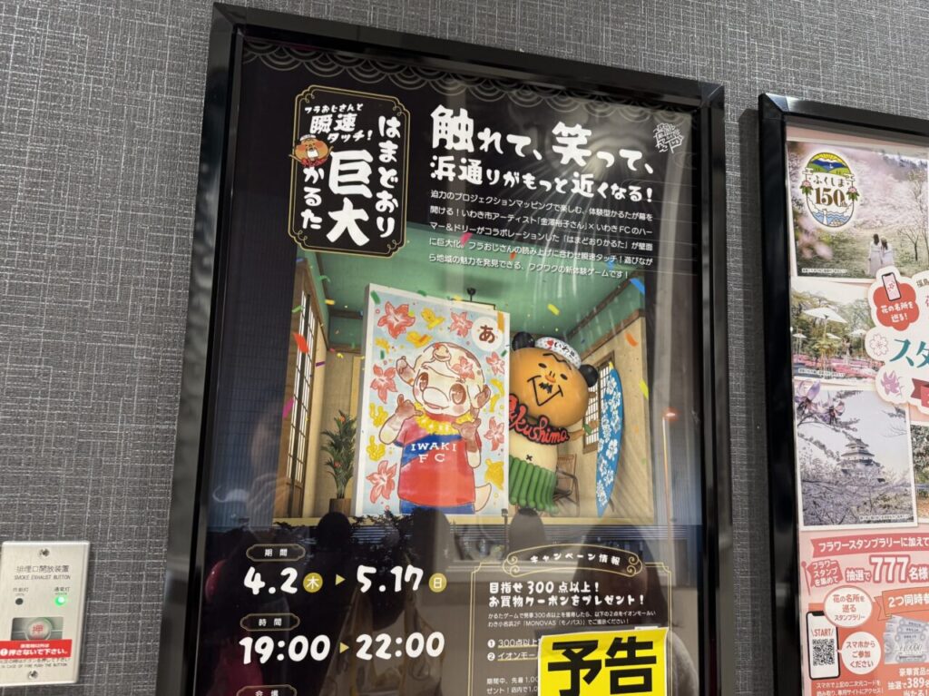 いわき市アーティスト「金澤裕子さん」といわきFCのハーマー&ドリーがコラボレーションした「はまどおりかるた」が壁面に巨大に投影されます。