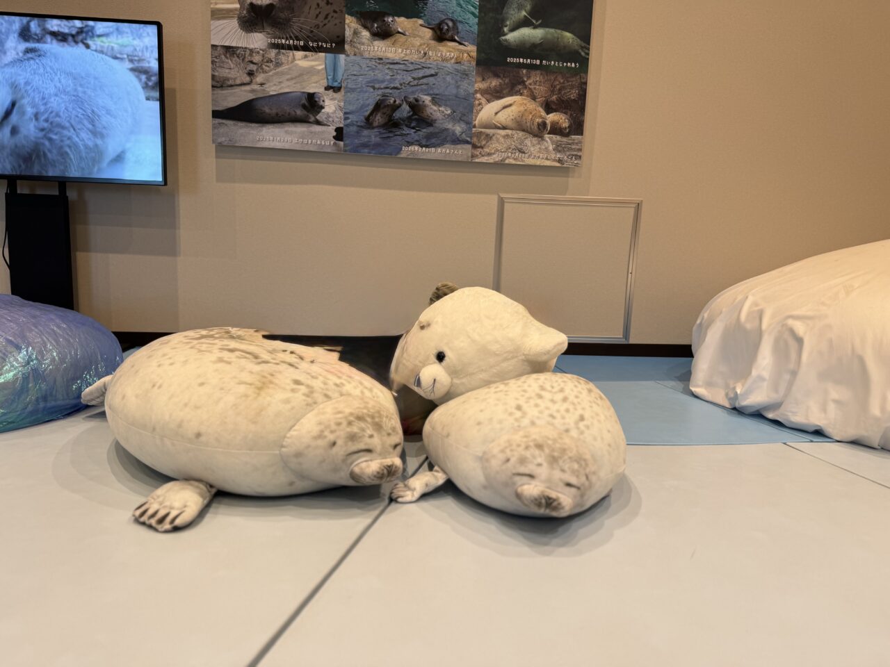 見るだけでも癒される、可愛らしいぬいぐるみもあり、映像を見ながらゆっくりと過ごすことができるスペースがありました。